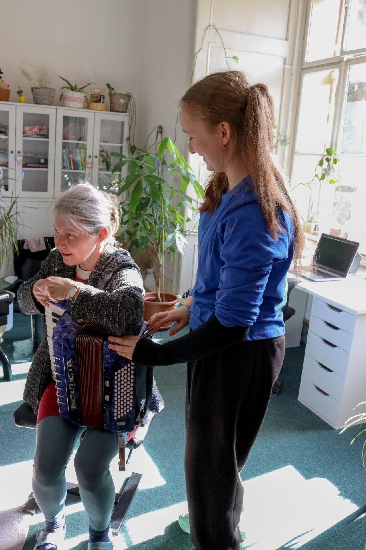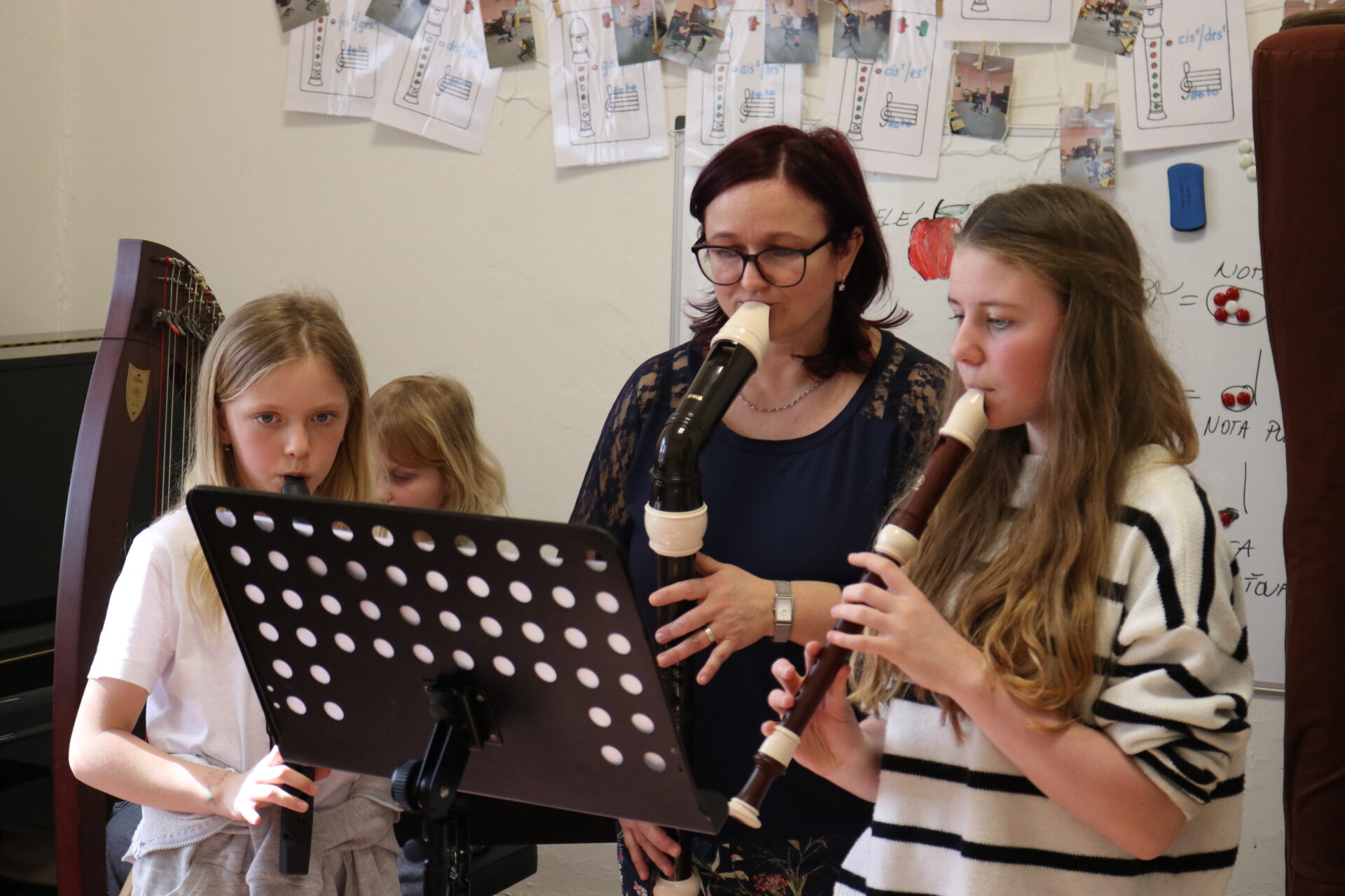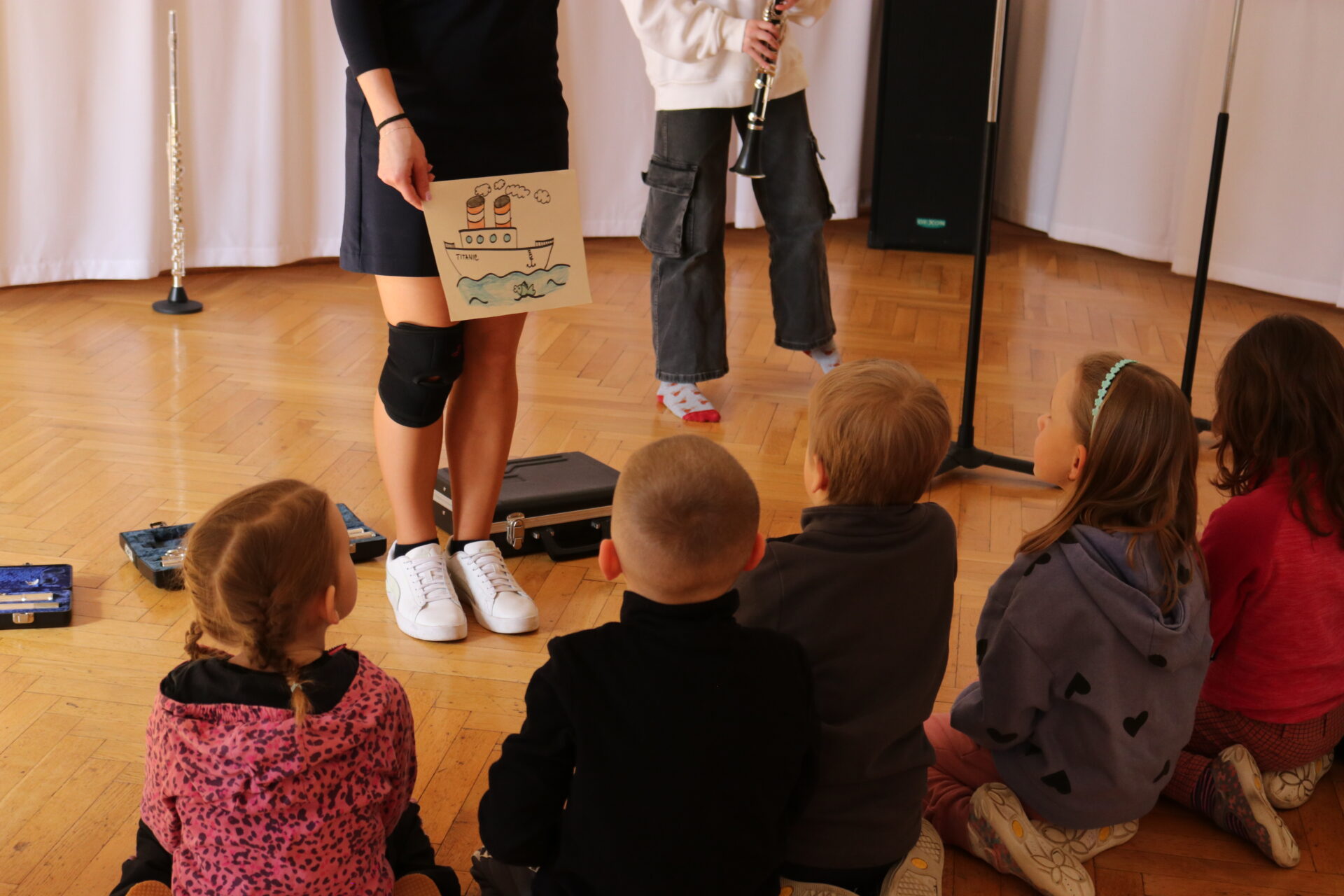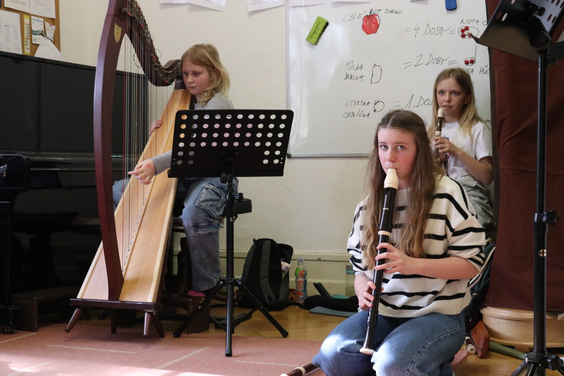 Zvláštní kouzlo měla zastávka u harfy, královského nástroje, jehož zvuk doplnily zobcové flétny. Setkání zde oživila i malá hra – děti musely splnit úkoly skřítka Notičky, aby „odčarovaly“ zakleté muzikanty a mohly pokračovat v hudebním putování.