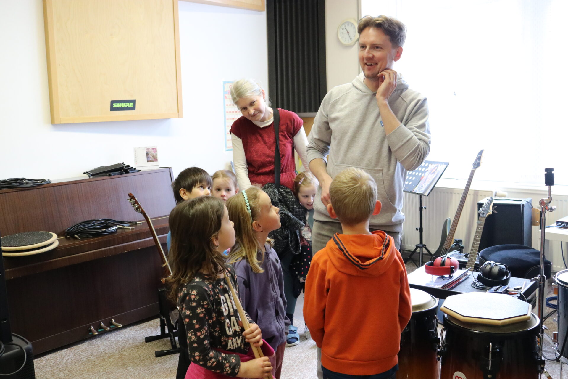 Putování začalo v učebně dechových nástrojů, kde se malí návštěvníci seznámili s bohatstvím žesťové rodiny – od jemného zvuku trubky až po hluboký tón heligonu. Nechyběl ani tradiční budíček a večerka a s pomocí dusítka dokázal trombon vykouzlit i nečekaně hravé zvuky.